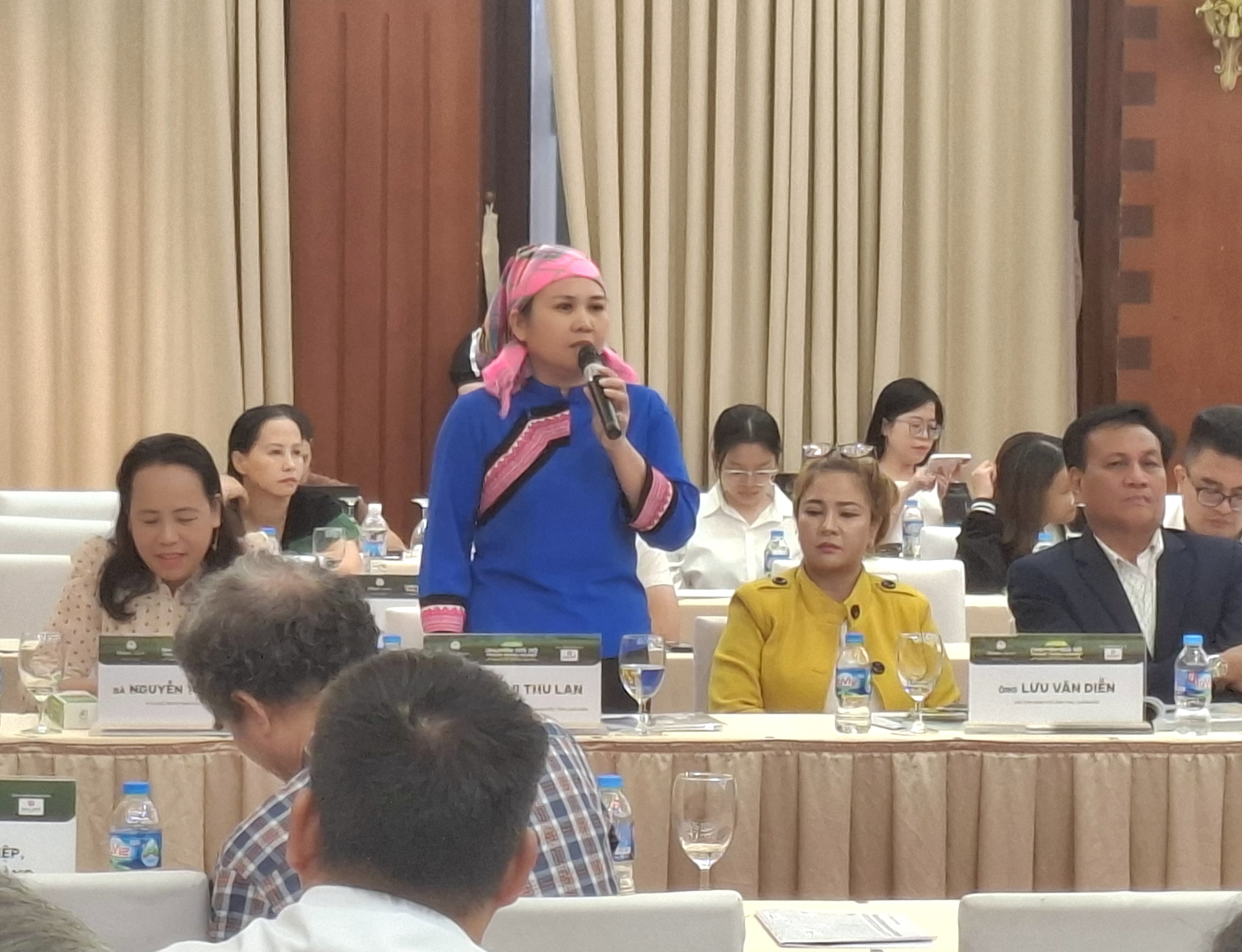 Bà Trần Thị Thu Lan - Giám đốc HTX sản xuất dịch vụ nông sản Bản Quyền phát biểu tại Diễn đàn.