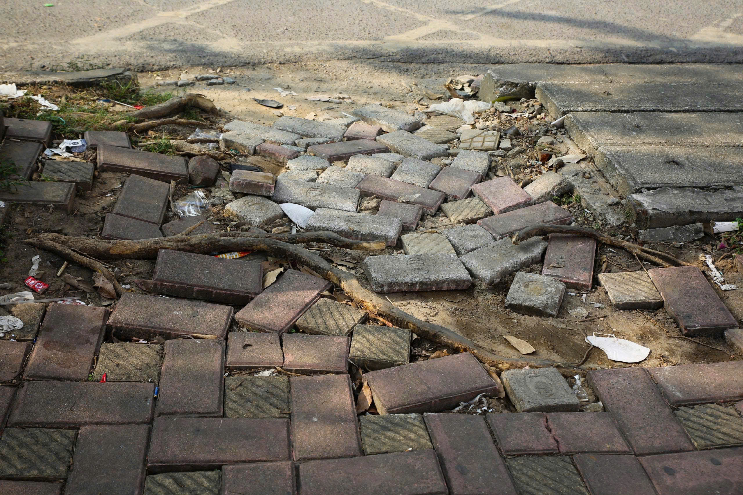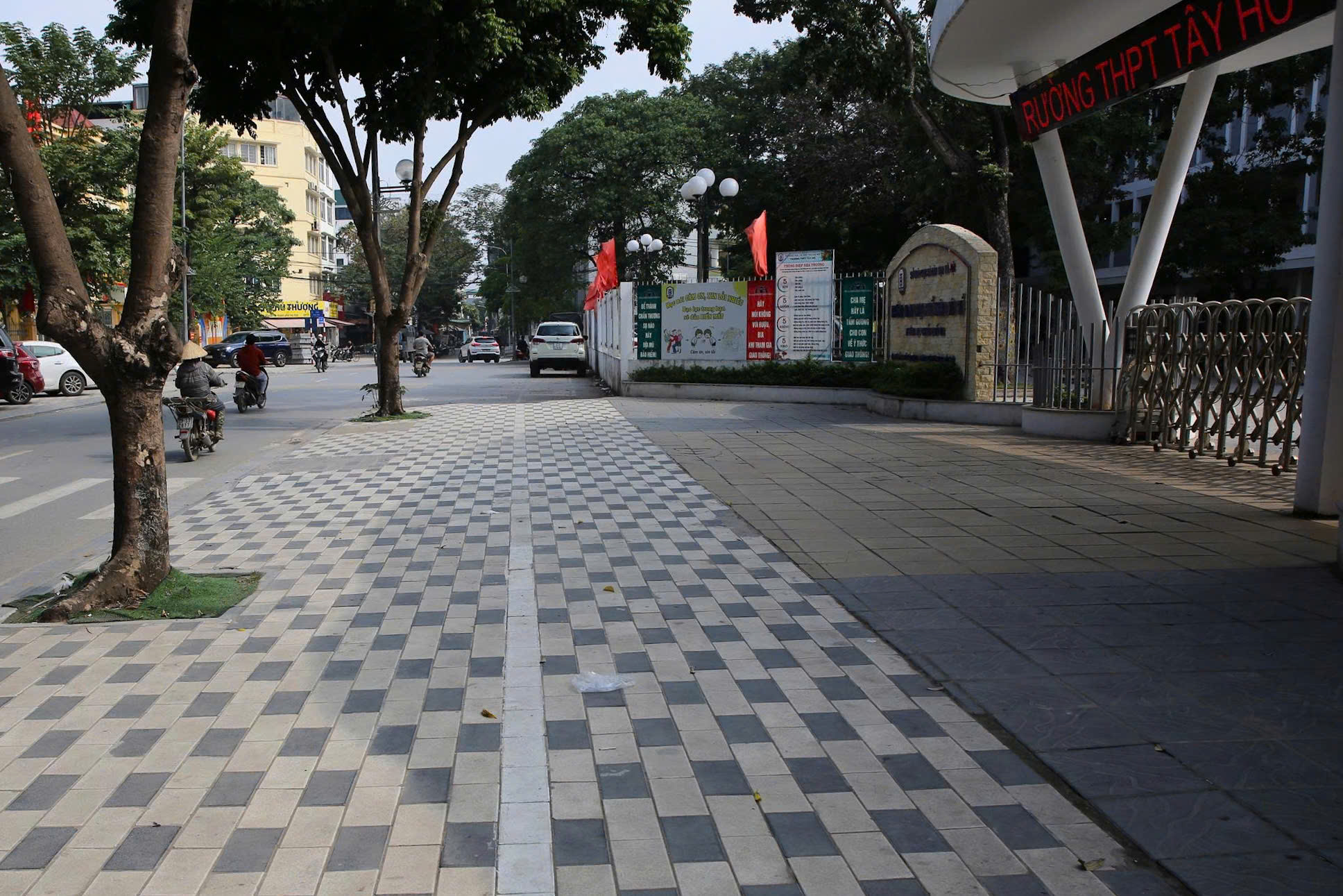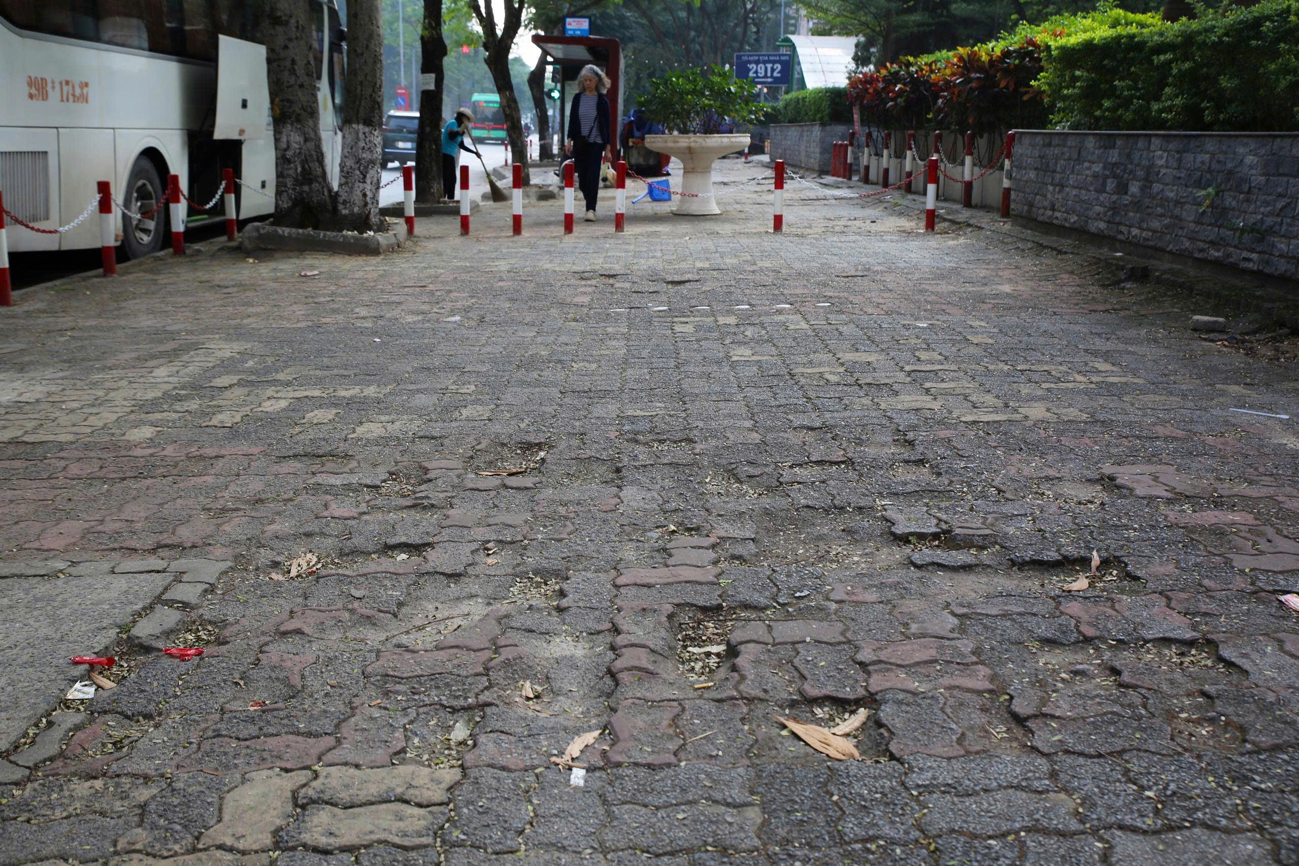 Vỉa hè trên phố Hoàng Đạo Thúy xuống cấp nghiêm trọng, nhiều viên gạch bị vỡ nát, sắp xếp tạm bợ, ngổn ngang, gây khó khăn cho người đi bộ.