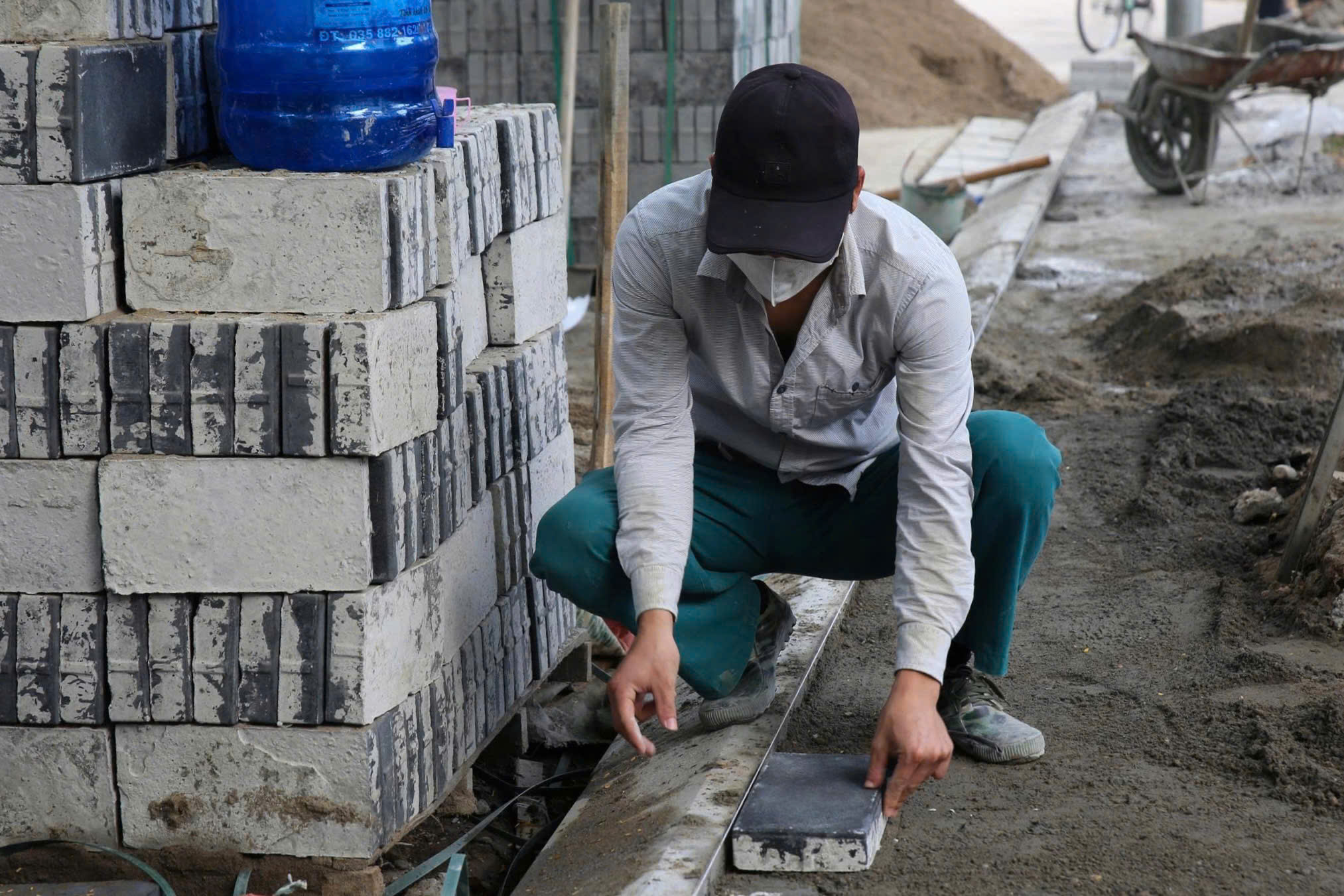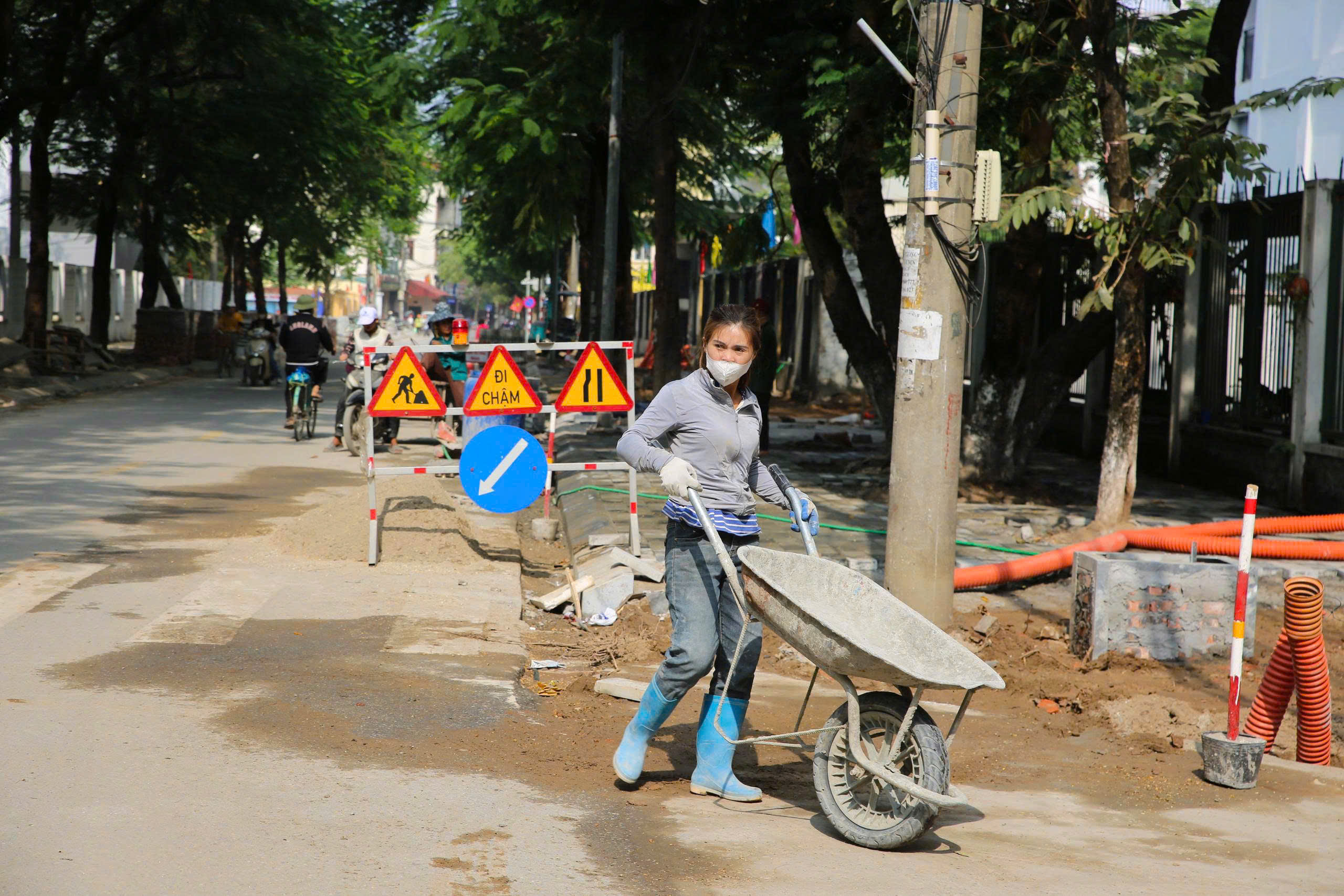 Các công nhân tất bật lát gạch vỉa hè trên phố An Dương Vương ngày 22/12/2025.