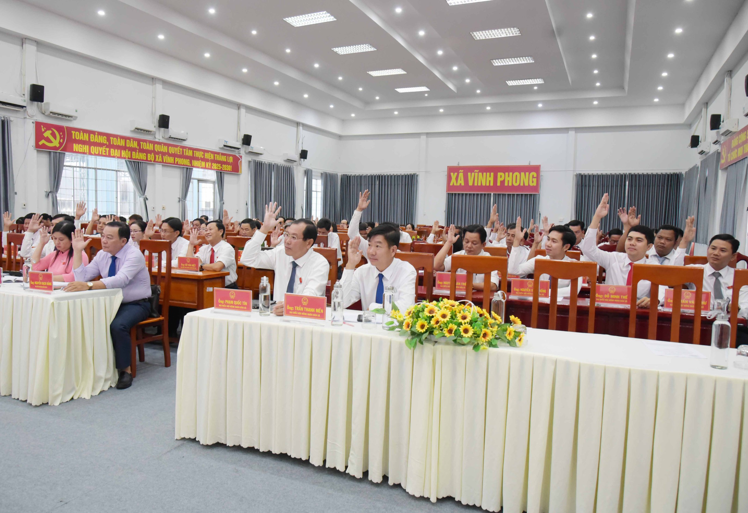 Tại kỳ họp, 100% đại biểu đã biểu quyết thông qua 10 Nghị quyết gồm: Nghị quyết về việc dự toán thu ngân sách nhà nước trên địa bàn và dự toán thu, chi ngân sách địa phương năm 2026; Nghị quyết về việc phân bổ chi ngân sách địa phương năm 2026; Nghị quyết về việc giao biên chế cán bộ, công chức trong cơ quan hành chính xã Vĩnh Phong năm 2026; Nghị quyết về việc giao biên chế viên chức trong đơn vị sự nghiệp công lập thuộc UBND xã Vĩnh Phong năm 2026; Nghị quyết về việc phê chuẩn cho thôi giữ chức vụ Trưởng Ban Kinh tế - Ngân sách HĐND xã Vĩnh Phong khóa XII, nhiệm kỳ 2021 - 2026; Nghị quyết về việc xác nhận bầu bổ sung chức vụ Phó Chủ tịch UBND xã Vĩnh Phong khóa XII, nhiệm kỳ 2021 - 2026 đối với ông Châu Ngọc Cẩn.