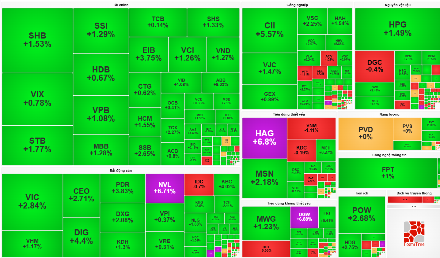 Nhóm ngành công nghiệp, công nghệ thông tin và bán lẻ cũng duy trì sức bật. FPT tăng 1%, MWG tăng hơn 1%, CII tăng hơn 5%, MSN tăng 2,2%.